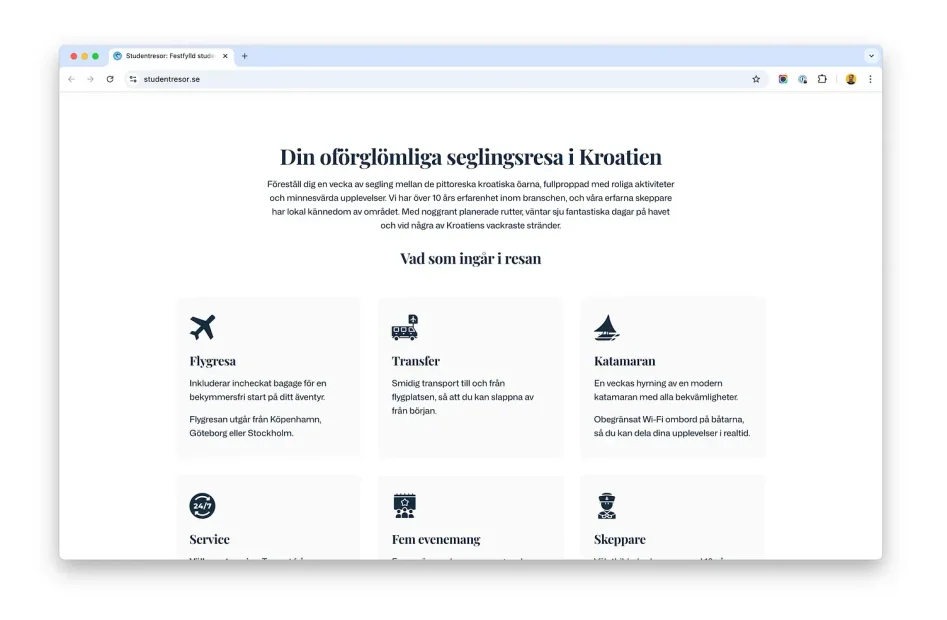 Vi byggde Studentresor.se från grunden och såg till att hemsidan blev både modern och responsiv, anpassad för både dator och mobil. Detta gjorde det enkelt för studenter att boka sin resa var de än befann sig. Samtidigt optimerades sidan för prestanda och smidig hantering, så att Studentresor kunde fokusera på det de gör bäst – att skapa oförglömliga resor.